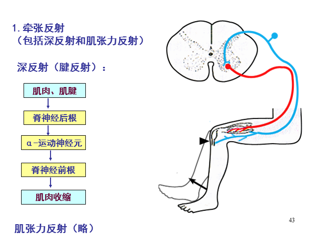 横断面以下脊髓所支配的骨骼肌紧张性降低甚至消失,外周血管扩张,血压下降,发汗放射不出现,二便潴留。说明动物躯体和内脏的反射活动均减退或者消失。 - 牵张反射:有神经支配的骨骼肌,在受到外力牵拉伸长时反射性引起受牵肌肉收缩【膝跳反射、跟腱反射】