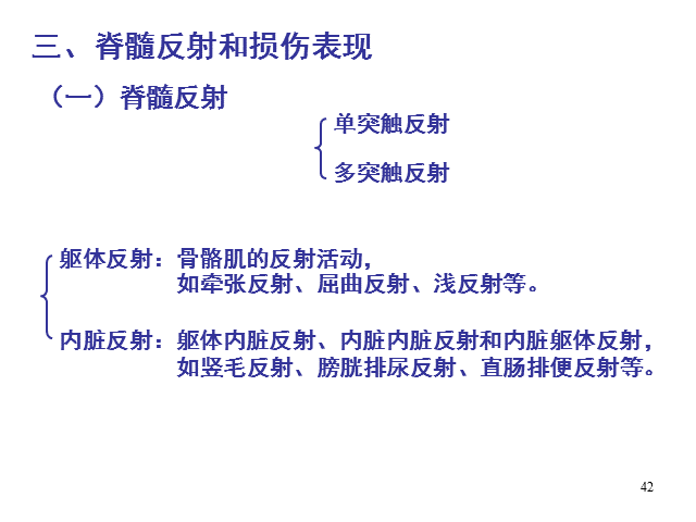 - 脊休克:与高位中枢离断的脊髓,暂时散失反射活动的能力,进入无反应状态。
