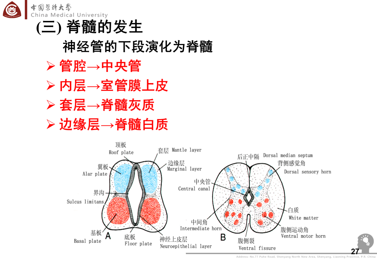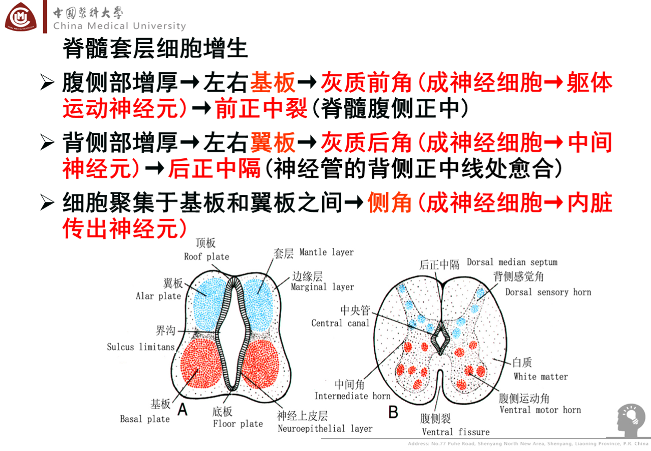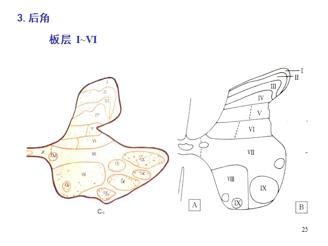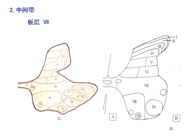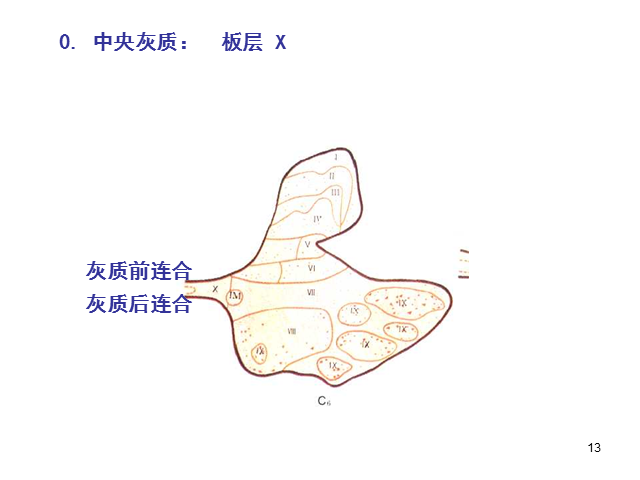 - 脊髓灰质:中央灰质、前角后角、中间带。