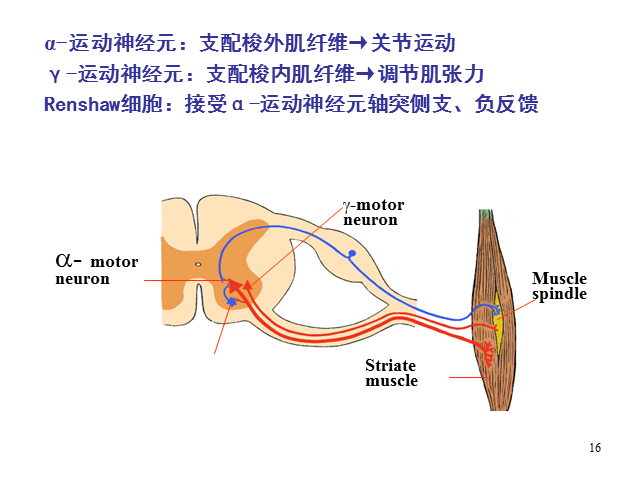 - γ僵直:高位中枢的下行性作用,提高γ运动神经元的兴奋性,造成肌梭传入神经冲动增多,转而增强α神经元活动,肌肉紧张性加强而出现僵直。