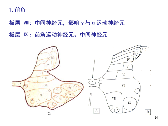 - 皮质脊髓侧束:直接间接(大多数且间接于IV~VIII中间神经元)终止与前角运动神经元主要是前角外侧核【管理四肢骨骼肌运动】